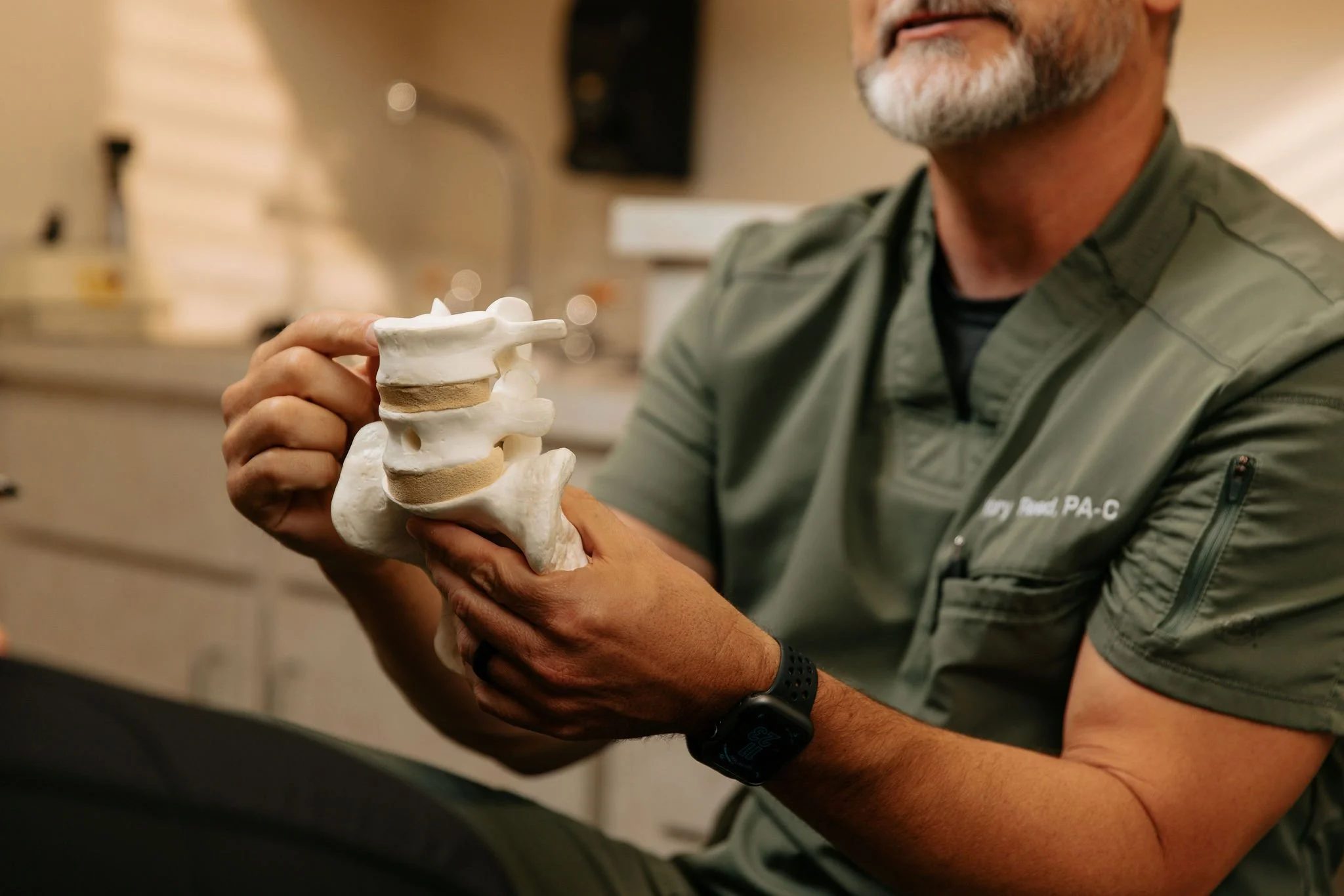 A man holds a model of human vertebrae, showing the spine, in a medical or chiropractic setting.