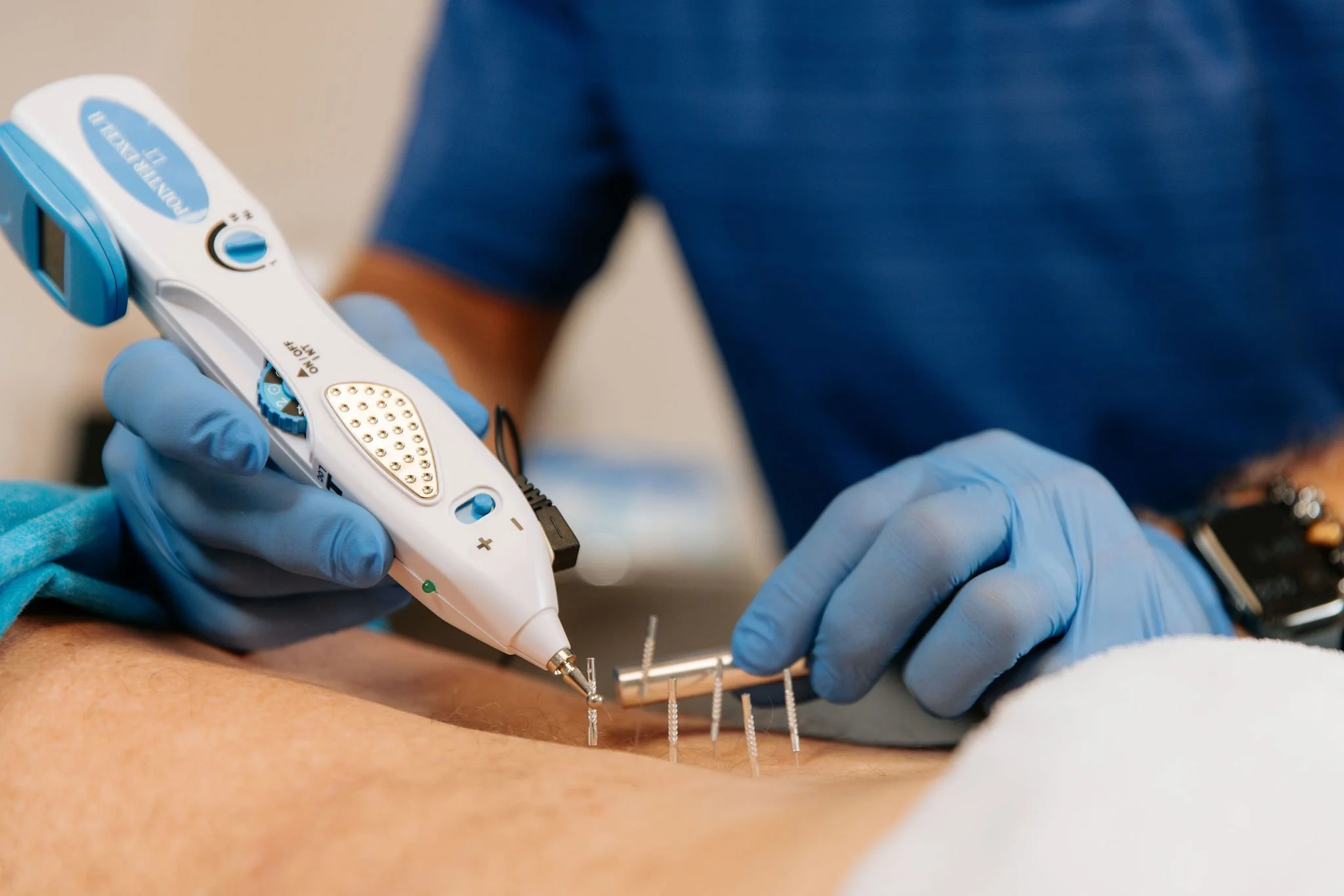 A healthcare professional using a laser device to treat a patient's skin, with several small medical nails or pins on the patient's skin, wearing blue gloves and a dark blue shirt.